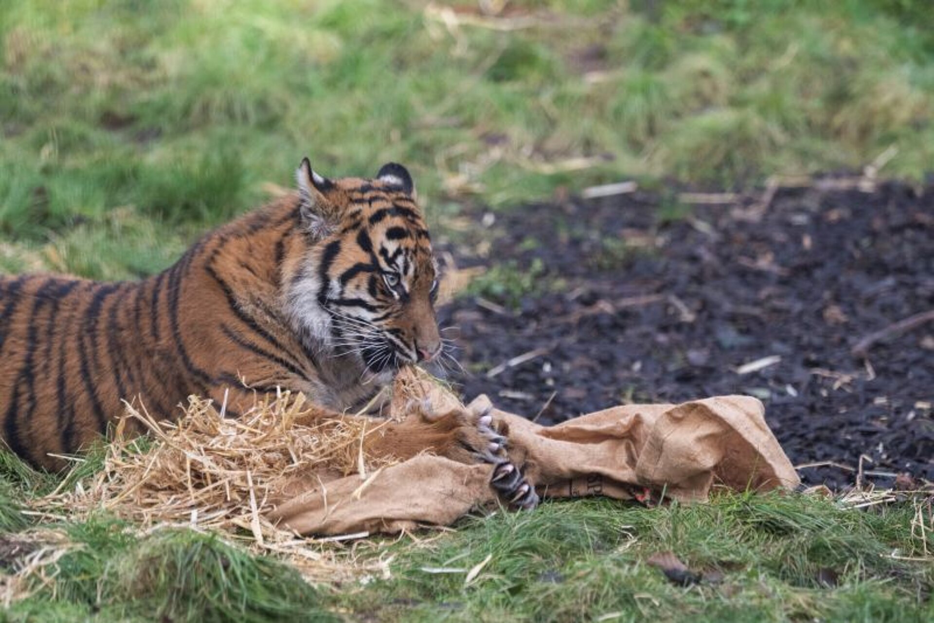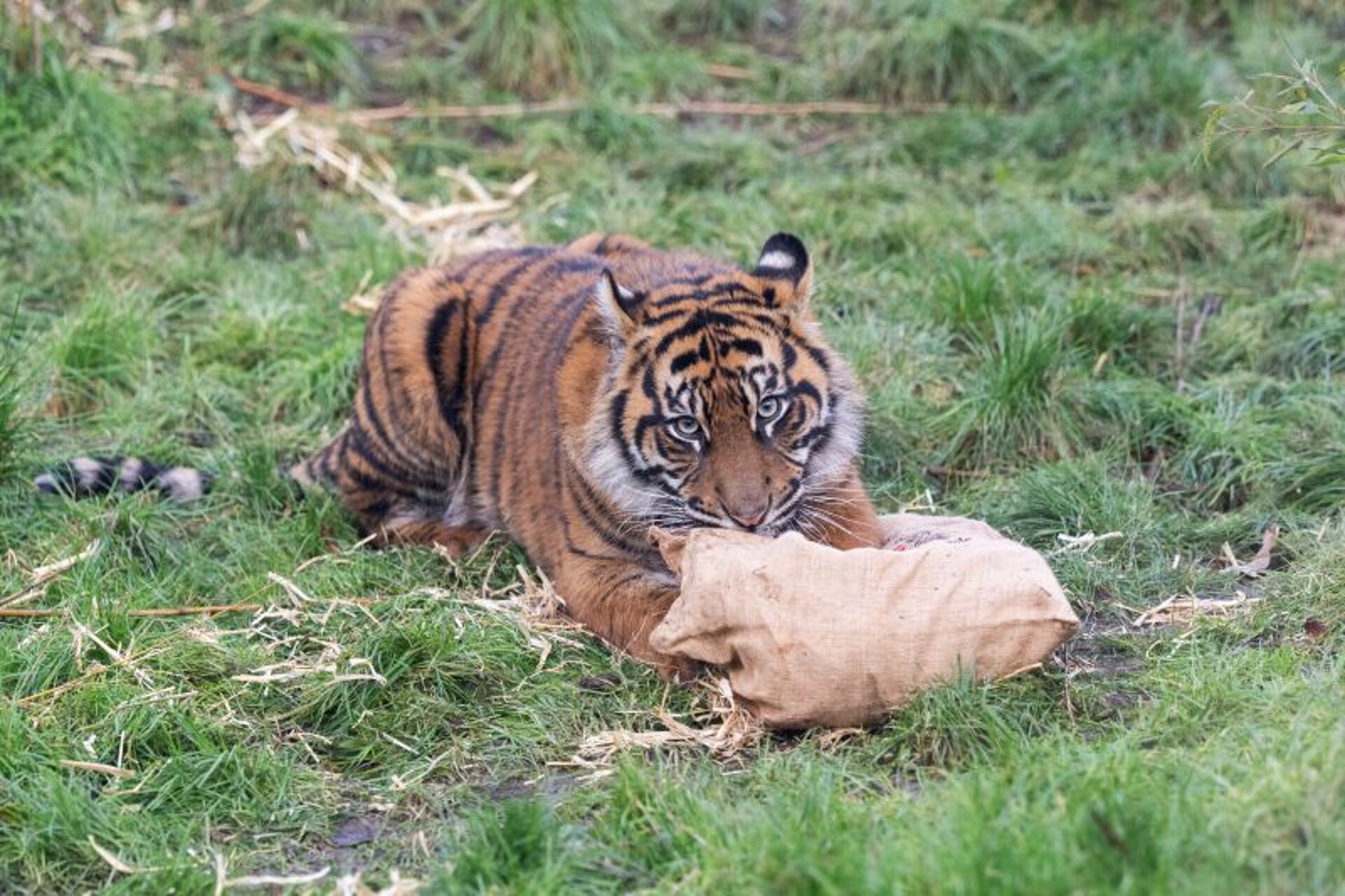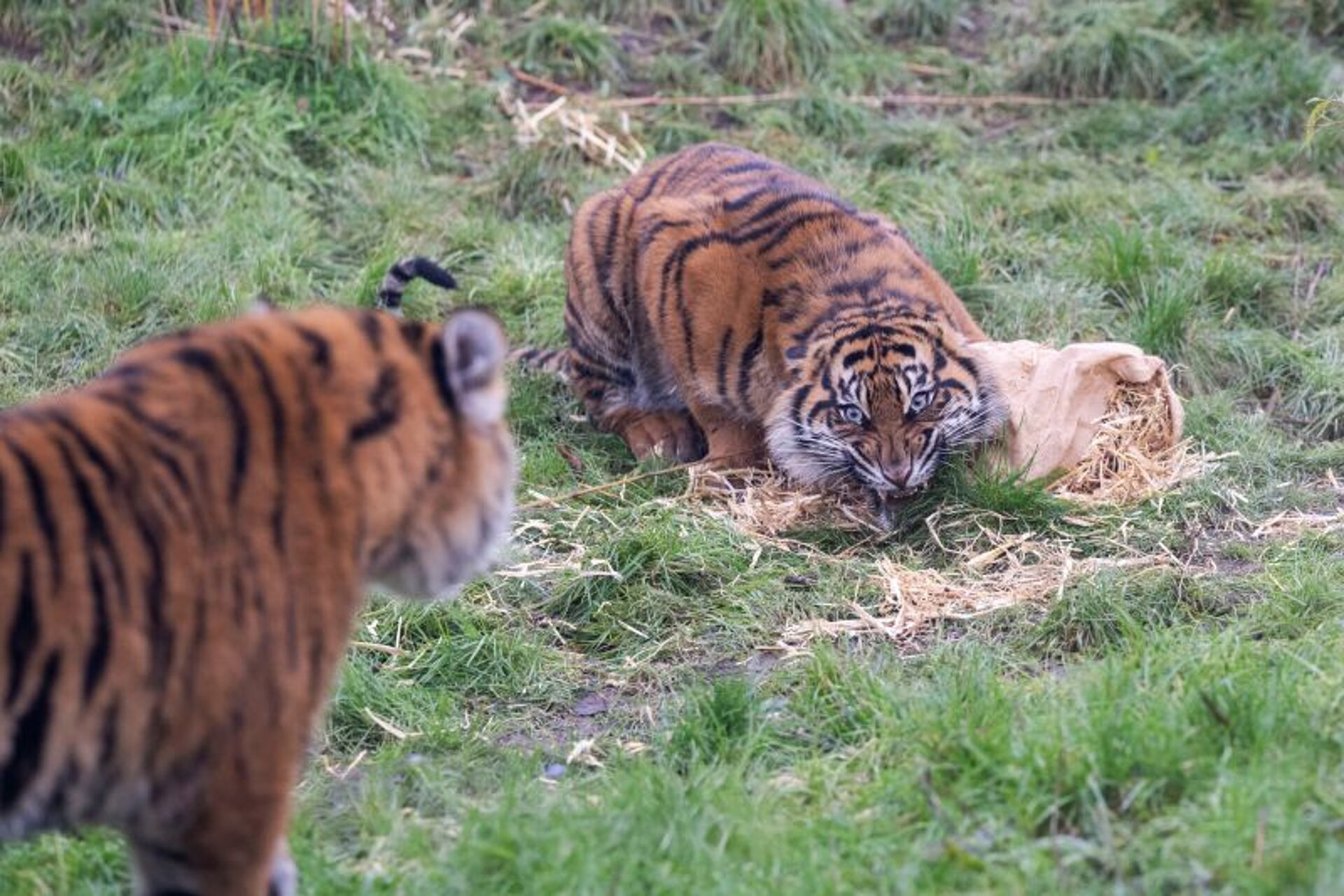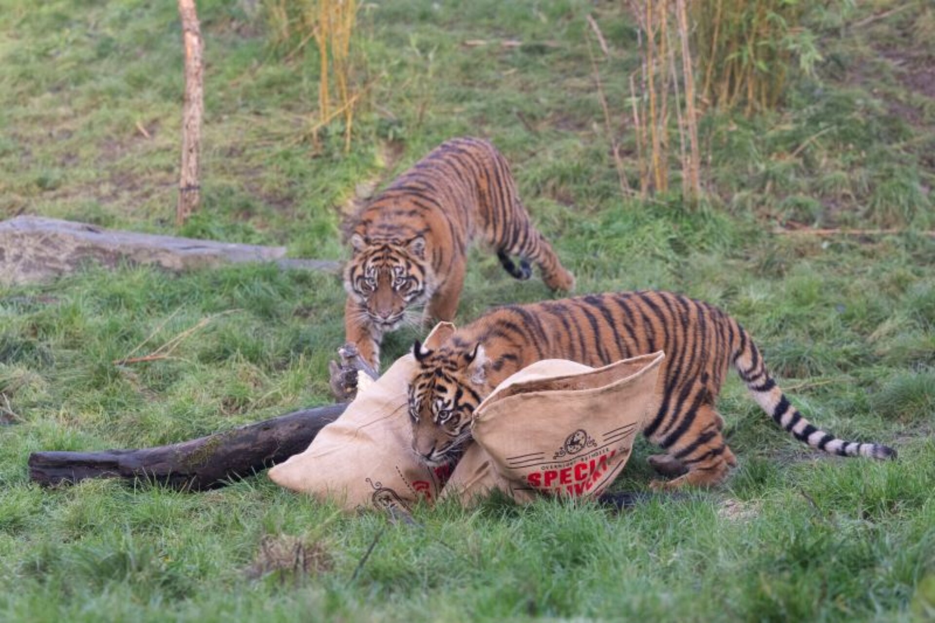 These were an instant hit, with the tigers excitedly grabbing a sack, tearing at it with their teeth and claws and fiercely guarding it, should a family member come too close!