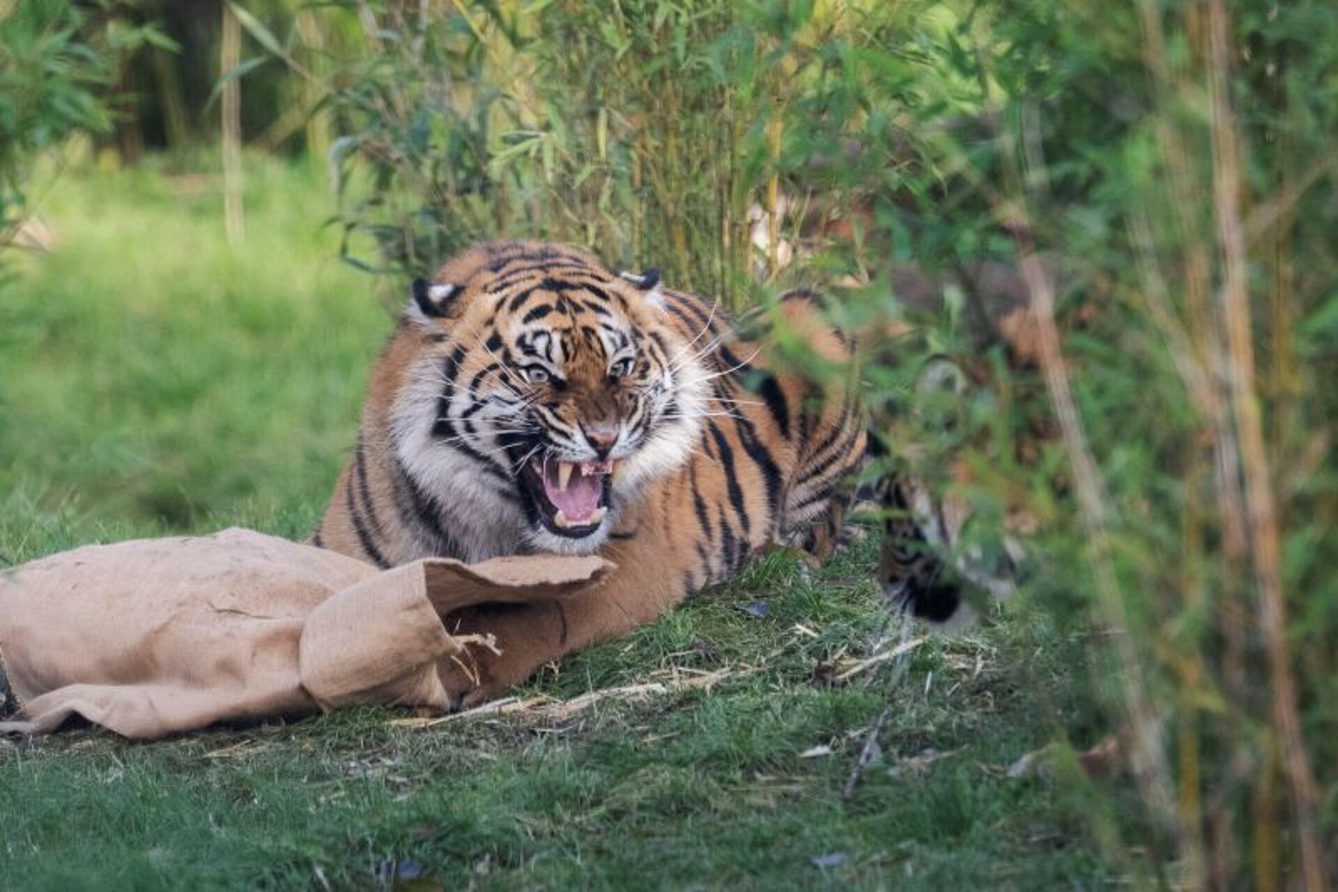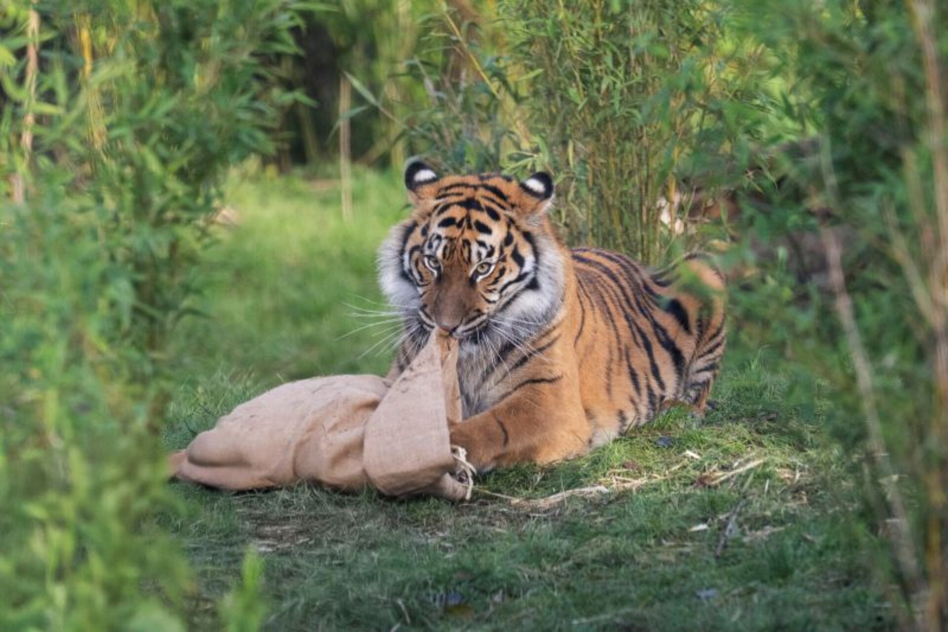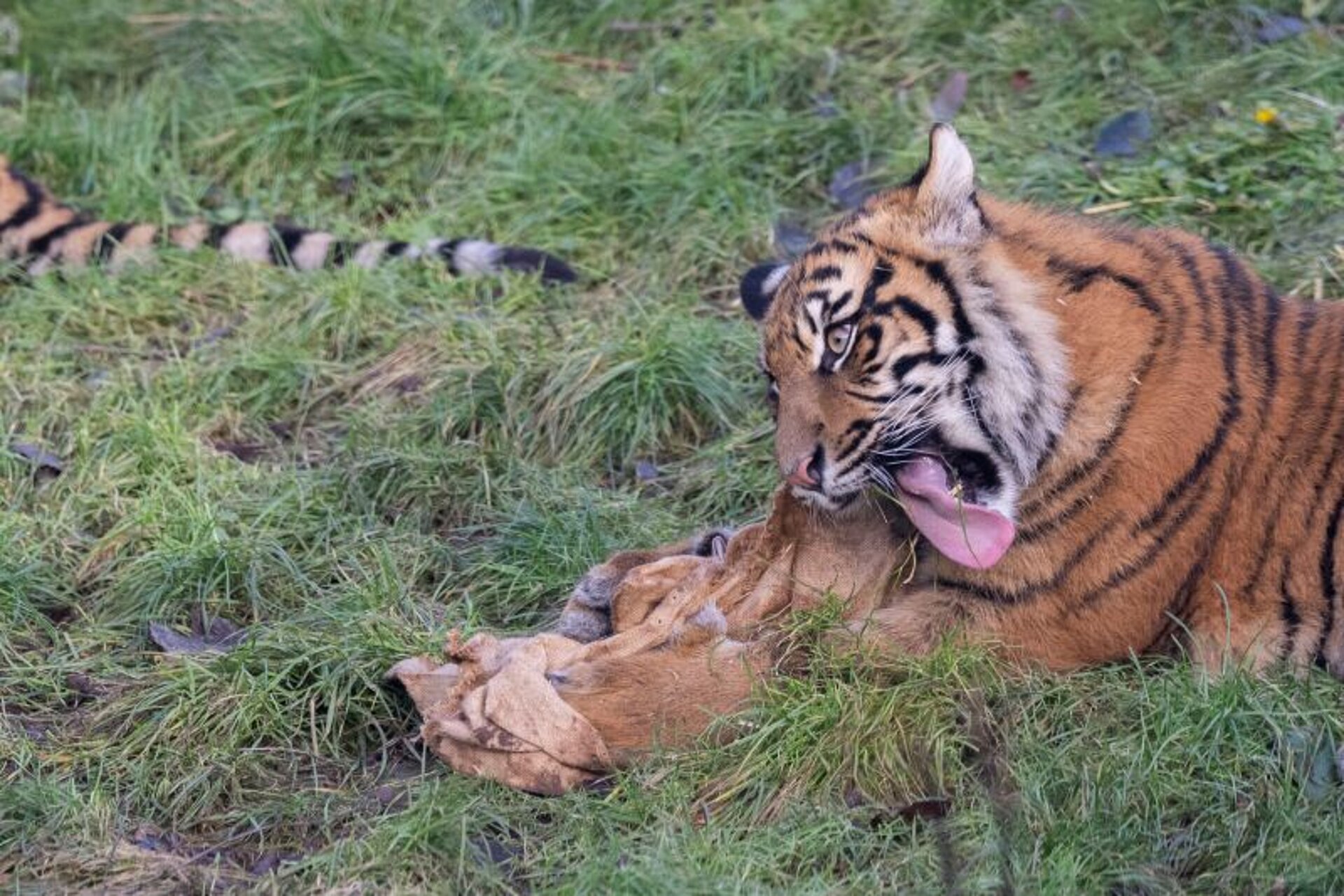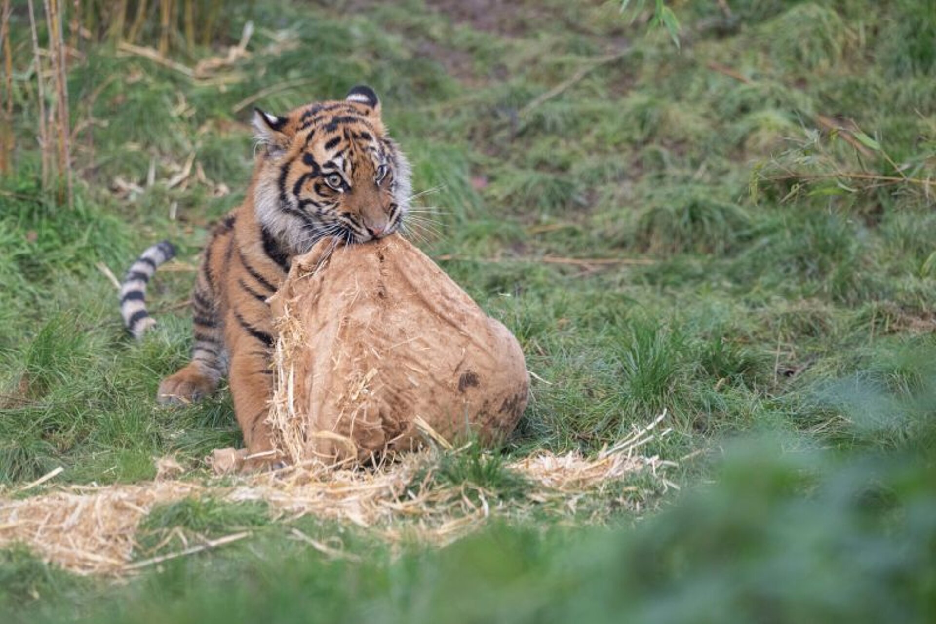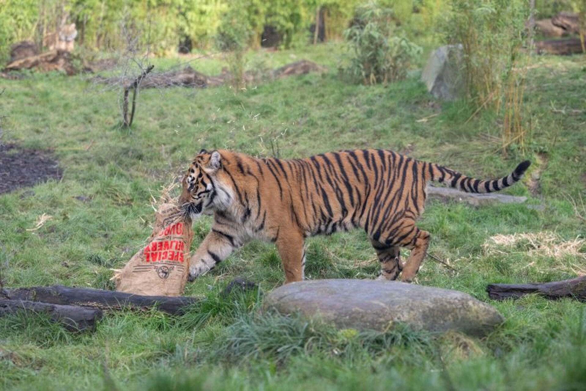 These were an instant hit, with the tigers excitedly grabbing a sack, tearing at it with their teeth and claws and fiercely guarding it, should a family member come too close!