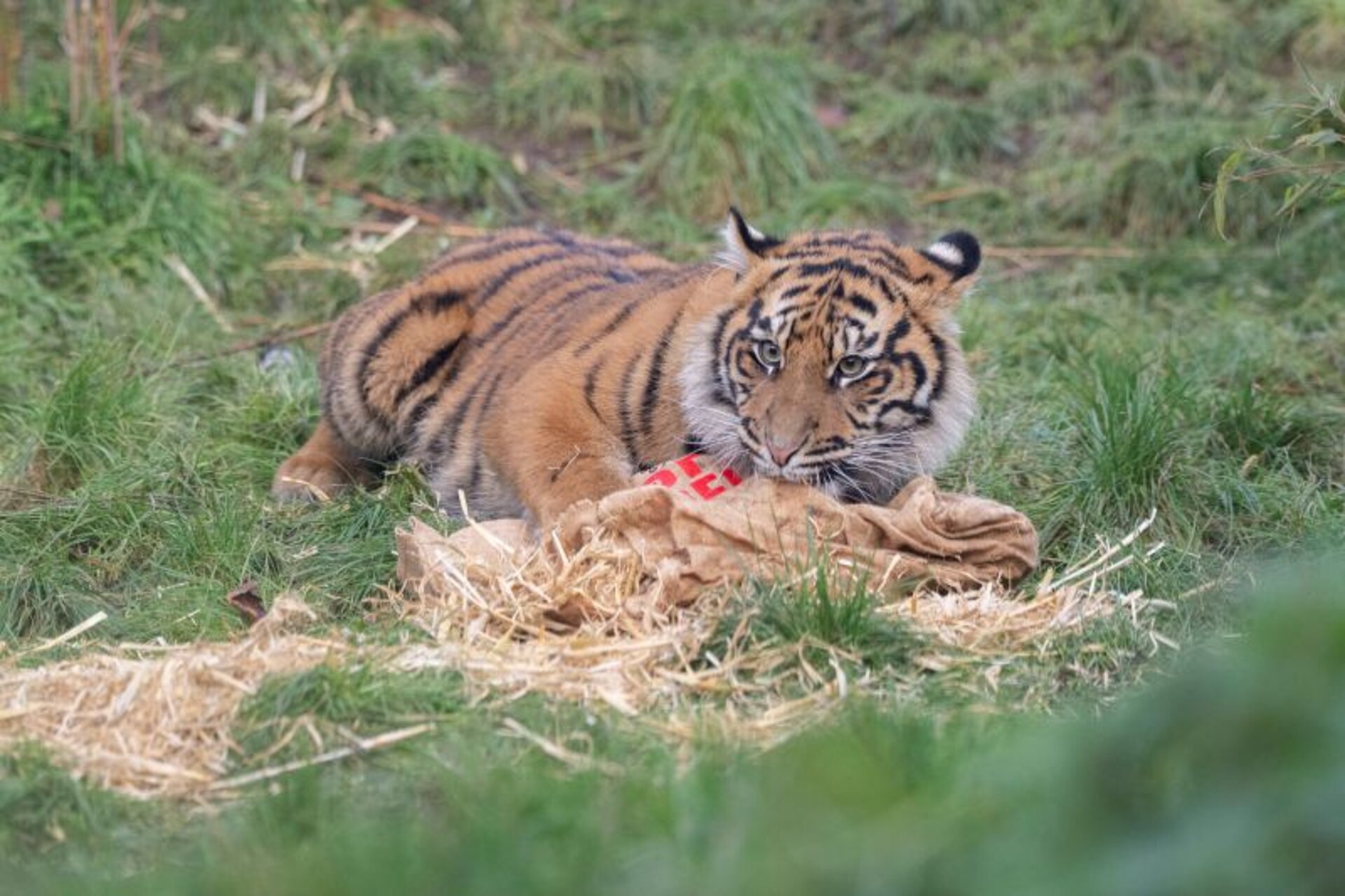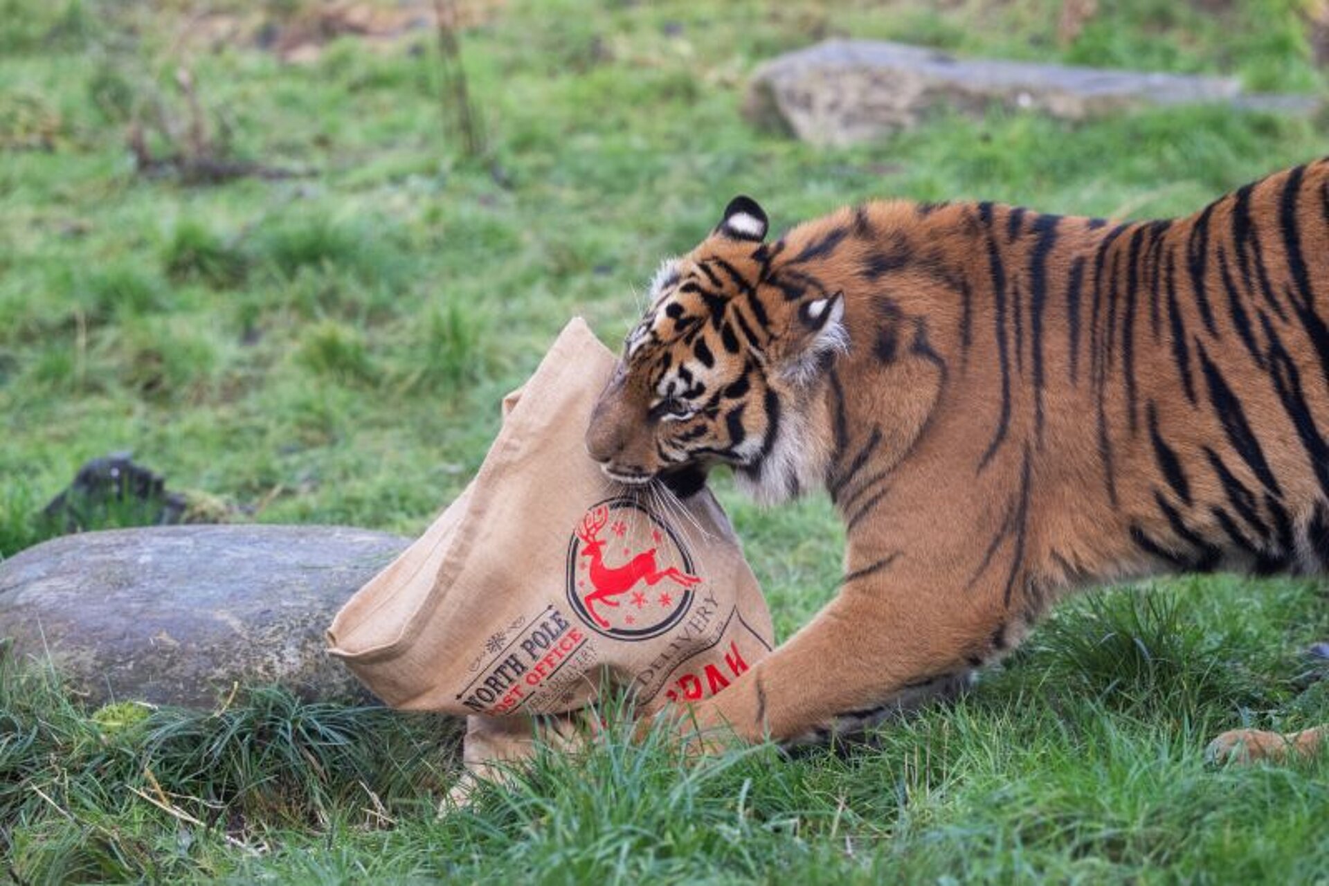 The 11-month-old Sumatran tiger cubs, Nova, Nadirah and Naresh, along with their older sister, Lestari and mum, Dourga, were gifted some personalised Santa sacks, filled with straw and fish, then finished with a spray of perfume.