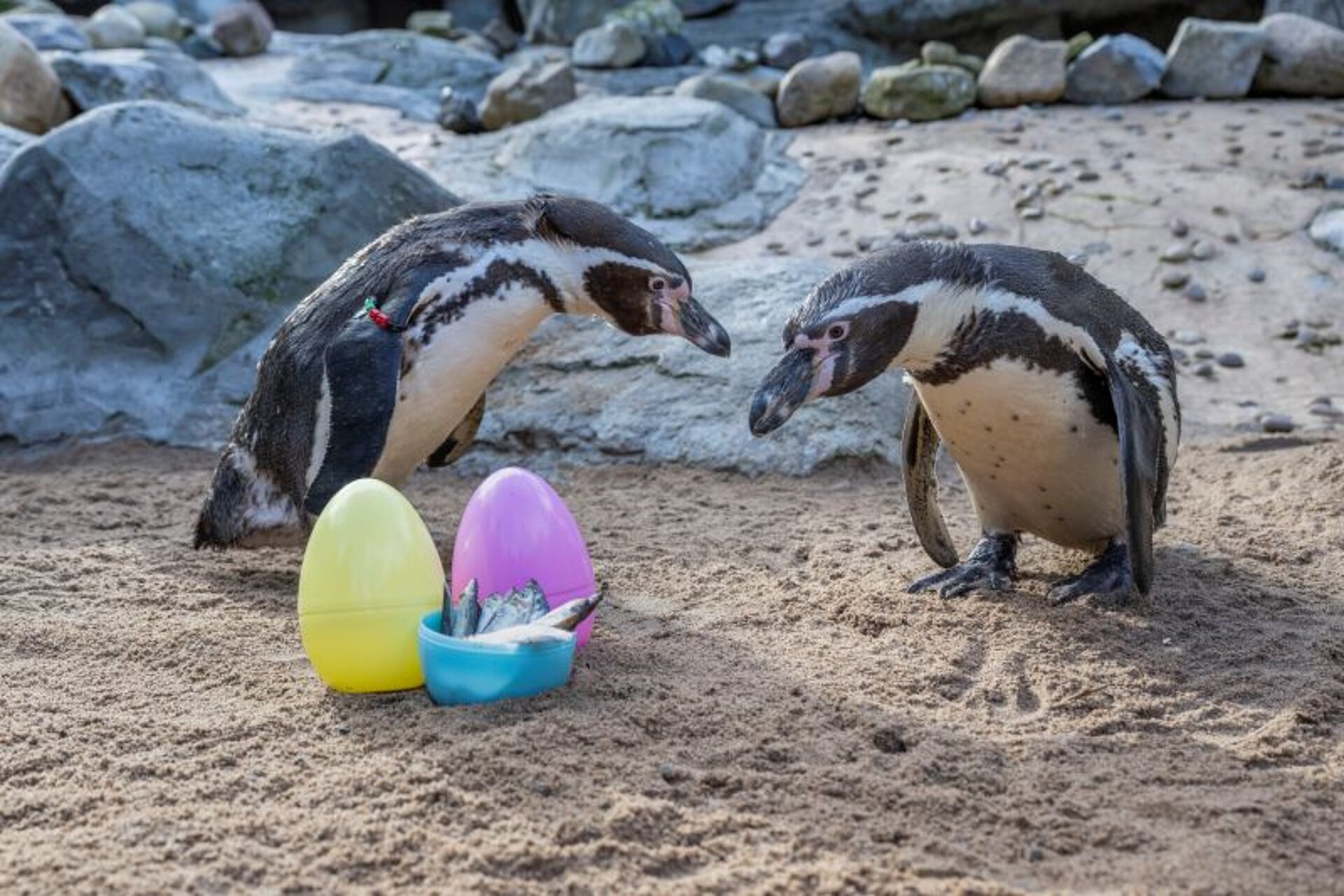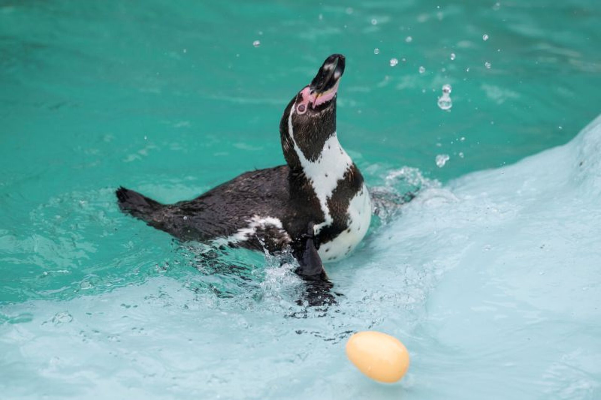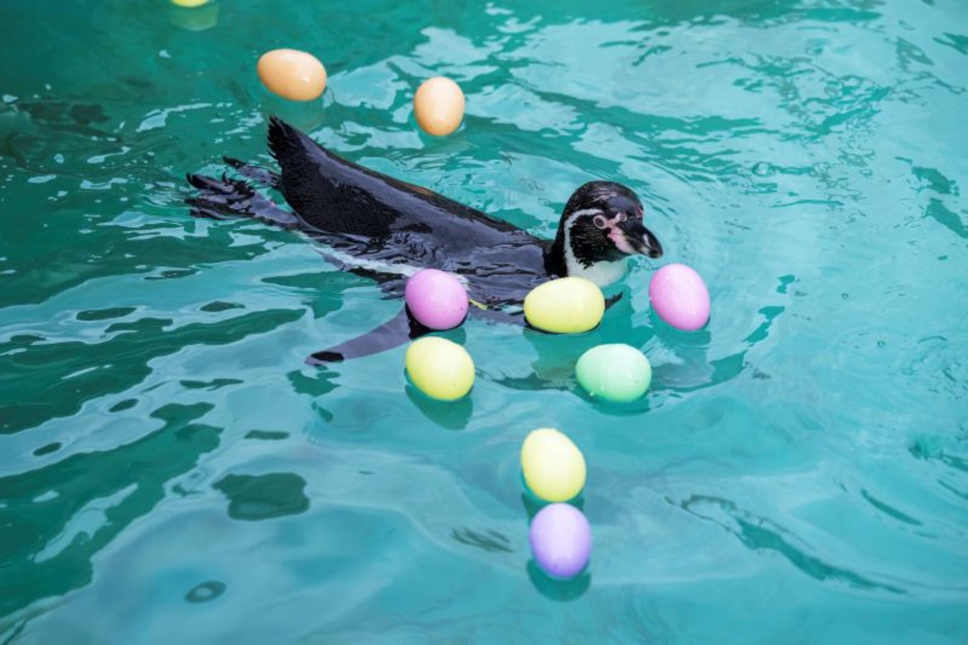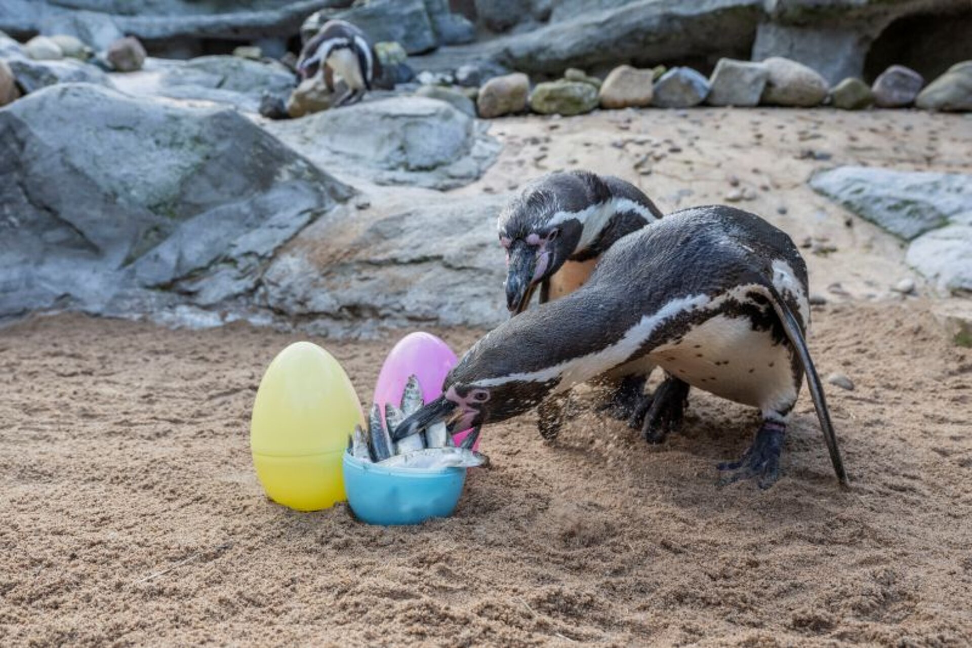 Keepers swapped the waddle of 15 penguins’ normal morning feed for a seasonal twist, introducing a variety of egg-themed surprises to their habitat.