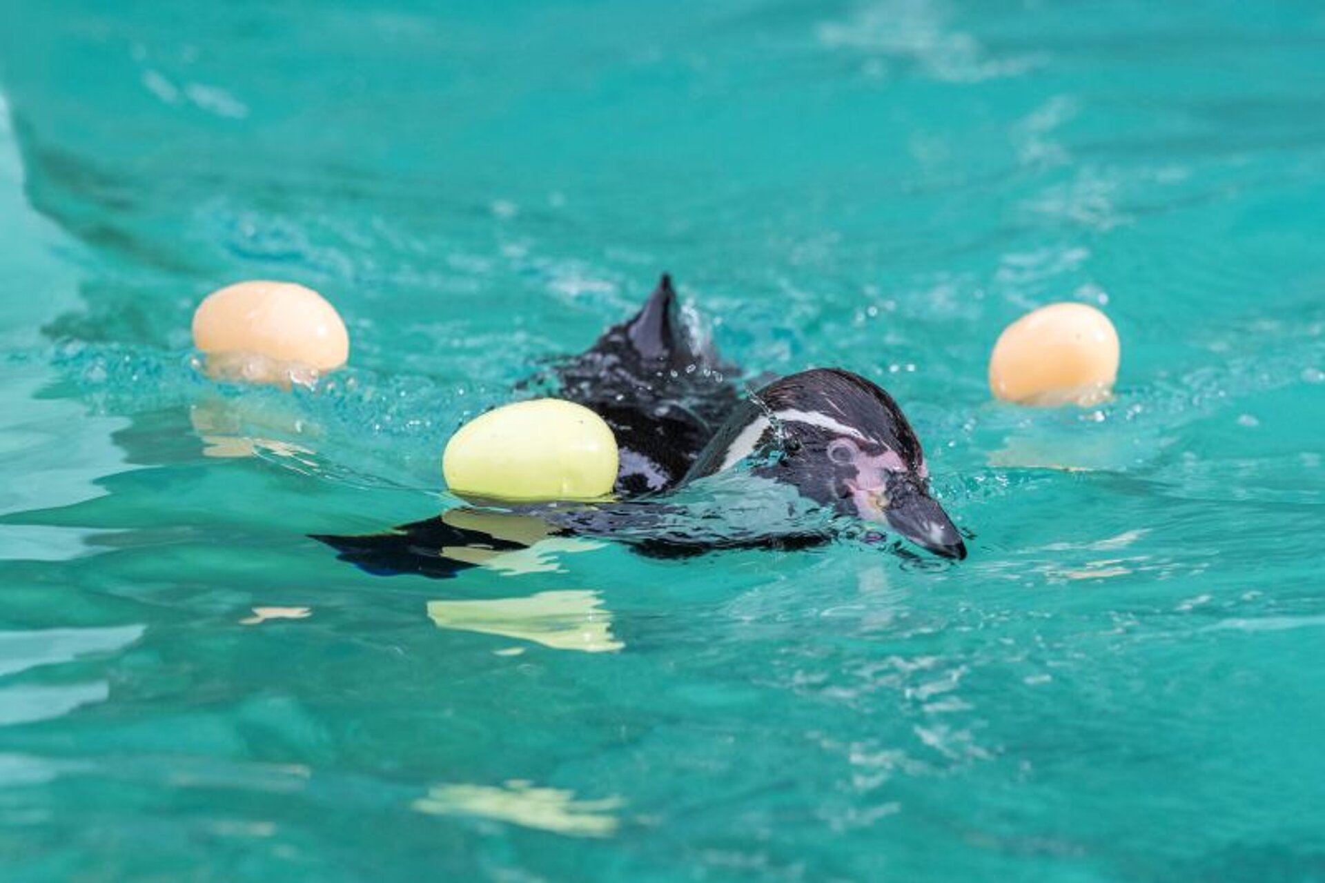 Smaller eggs were gently tossed into the pool, transforming the water into a playful arena as the curious birds chased, nudged and bobbed them across the surface, showing just how agile they are in the water.