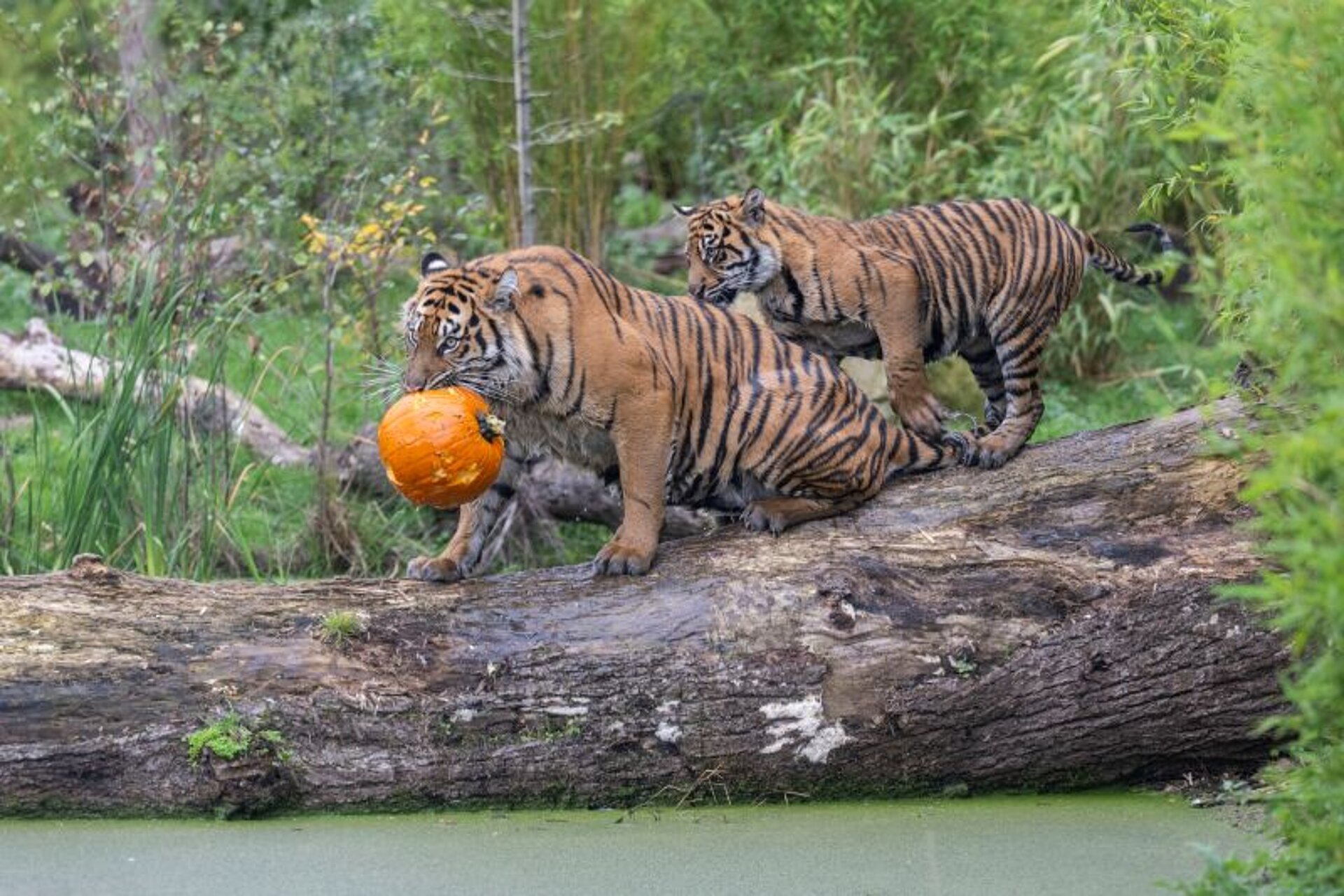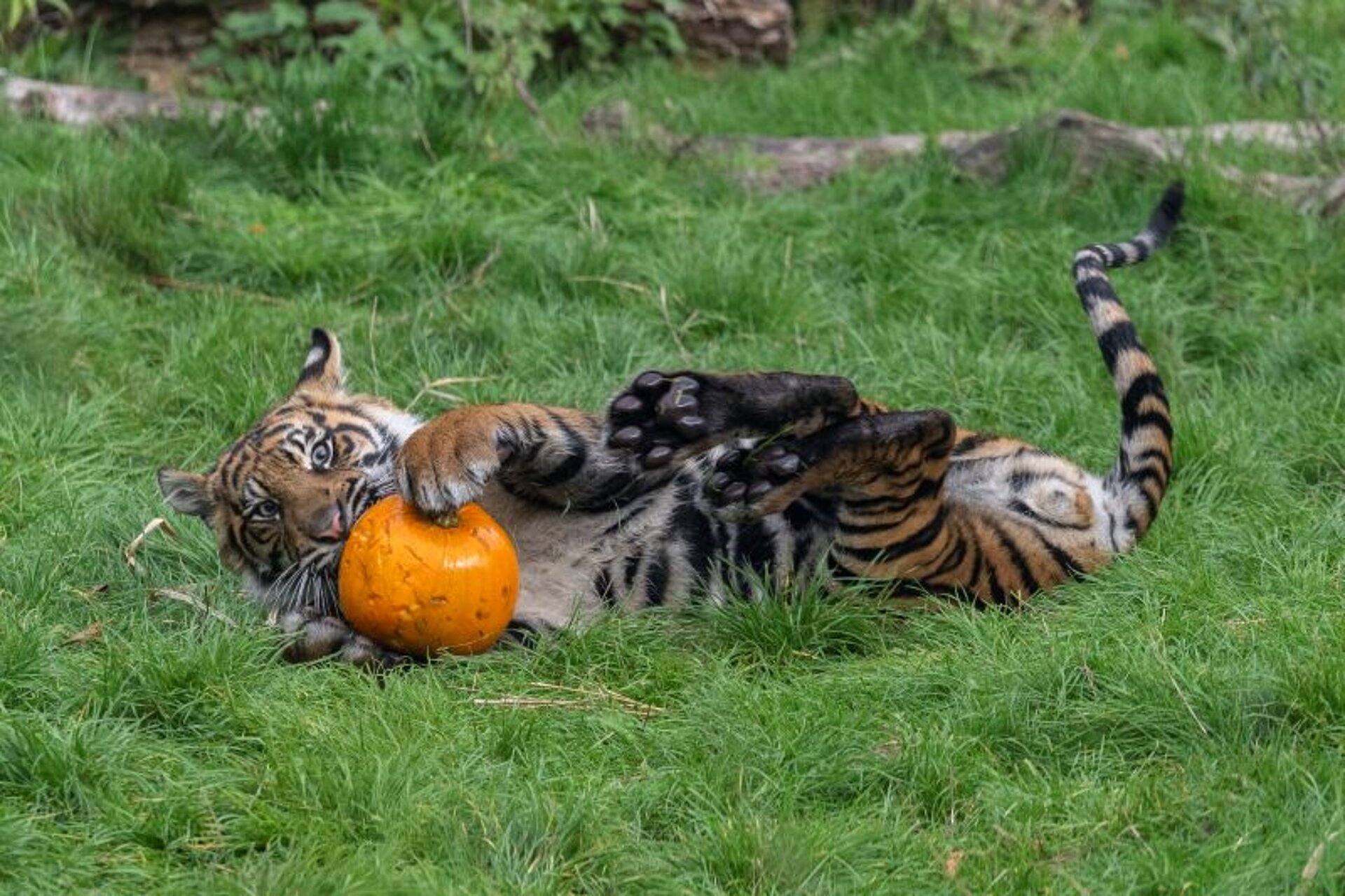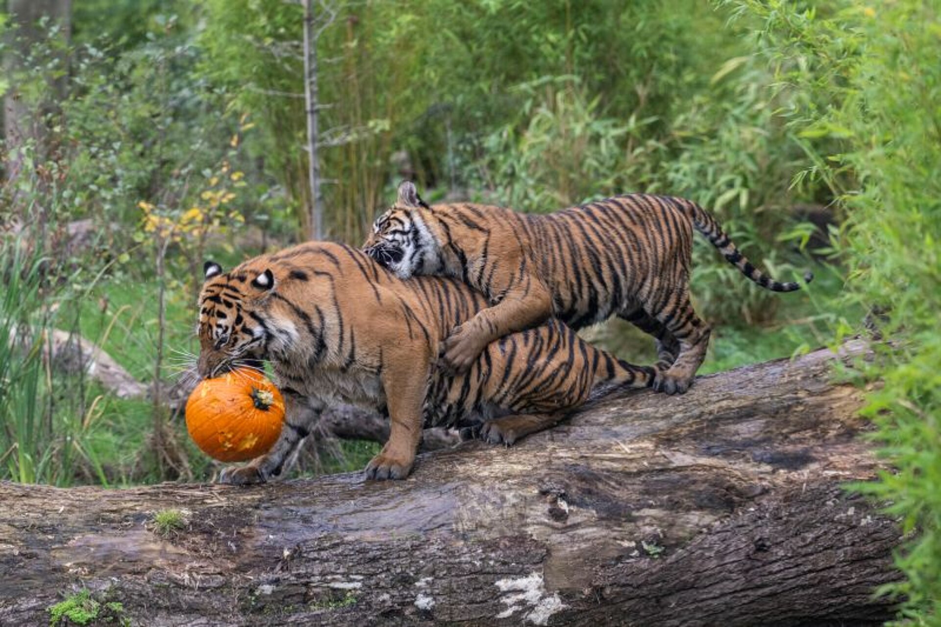 The pumpkins were also a huge hit, not only for the ten-month-old, Sumatran tiger cub triplets, but for their older sister too, two-year-old Lestari, who wasted no time in snatching a pumpkin up in her jaws and running off to play pumpkin-bobbing in the pool.