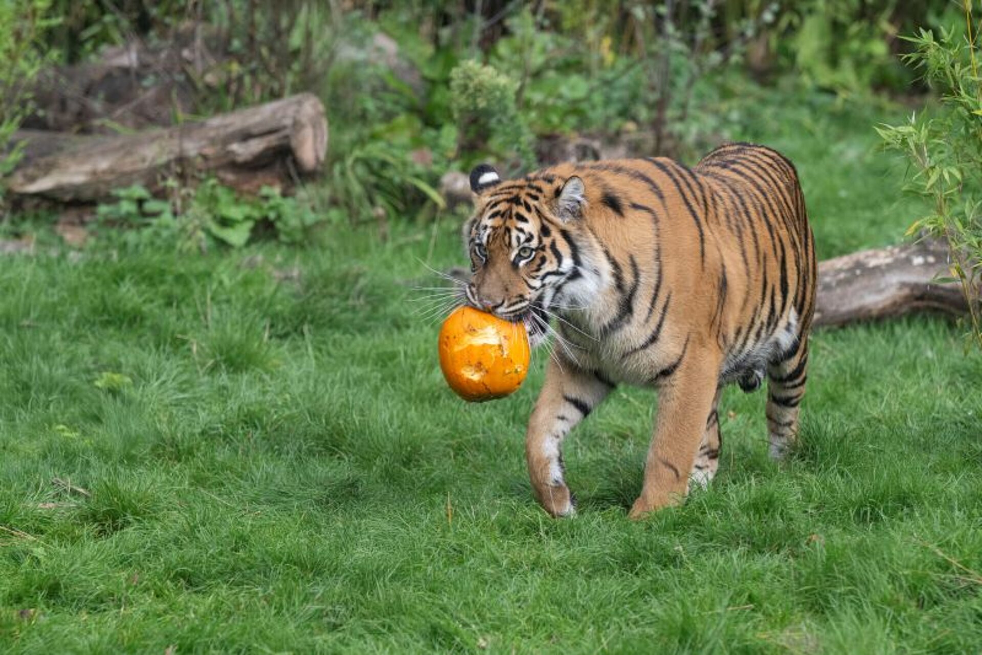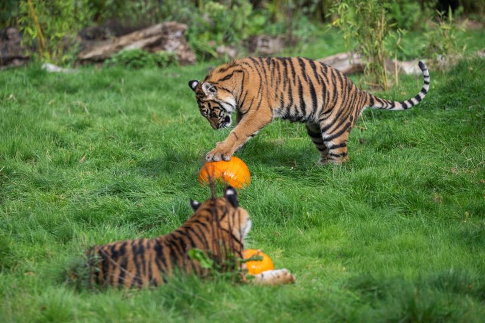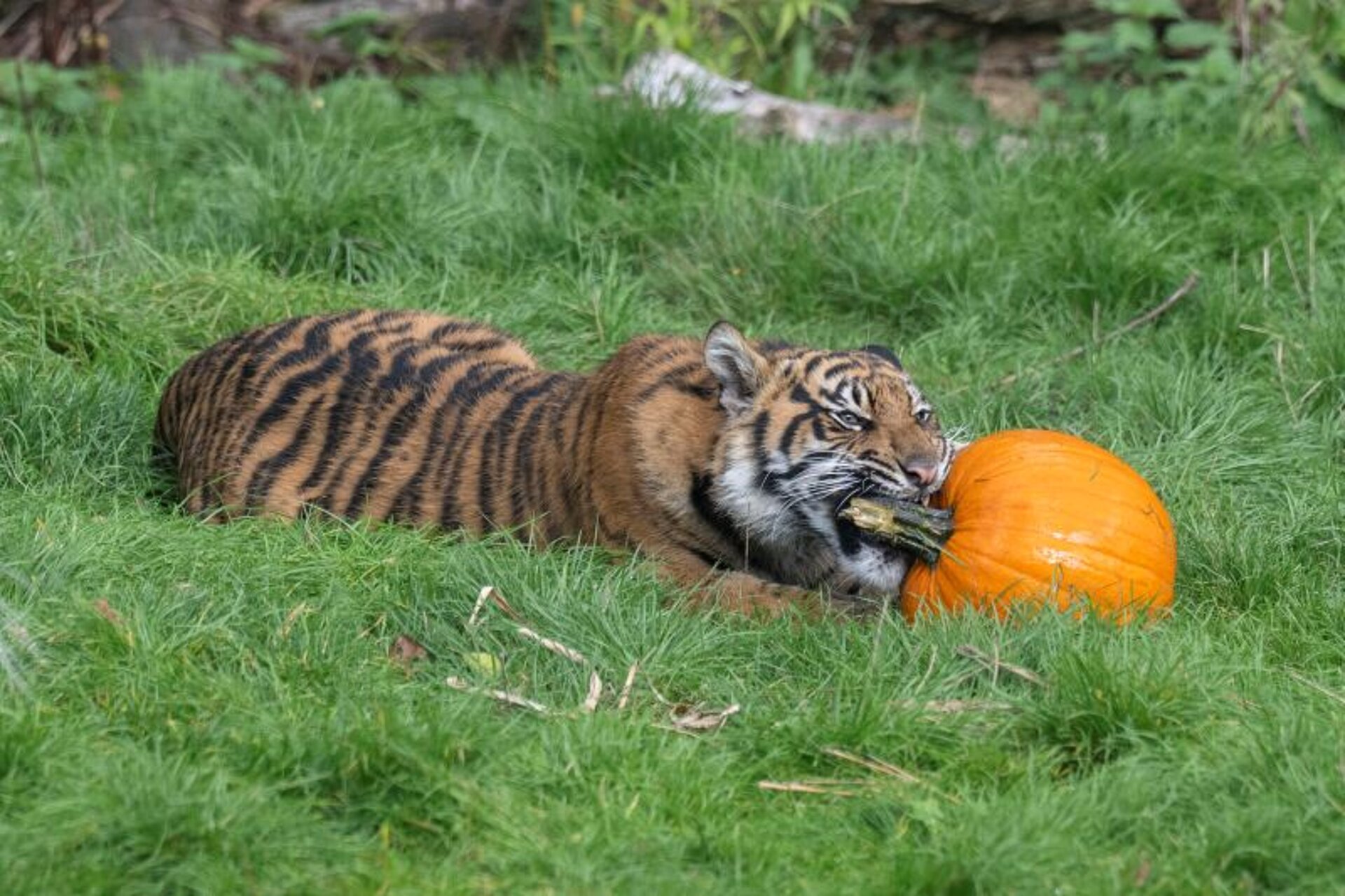 The pumpkins were also a huge hit, not only for the ten-month-old, Sumatran tiger cub triplets, but for their older sister too, two-year-old Lestari, who wasted no time in snatching a pumpkin up in her jaws and running off to play pumpkin-bobbing in the pool.