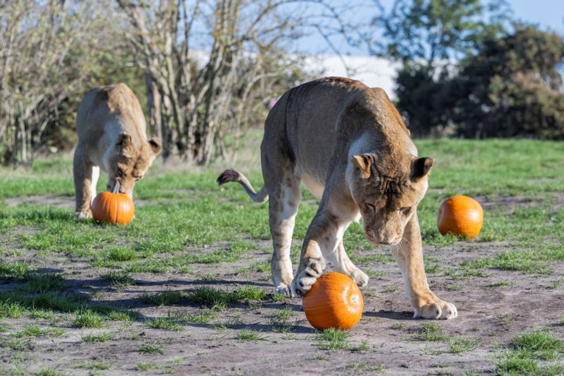 The trio of lion cubs, born in April this year, wasted no time getting stuck in, stalking their pumpkin prey, then pouncing on them, followed by fiercely protecting them from the rest of the pride.